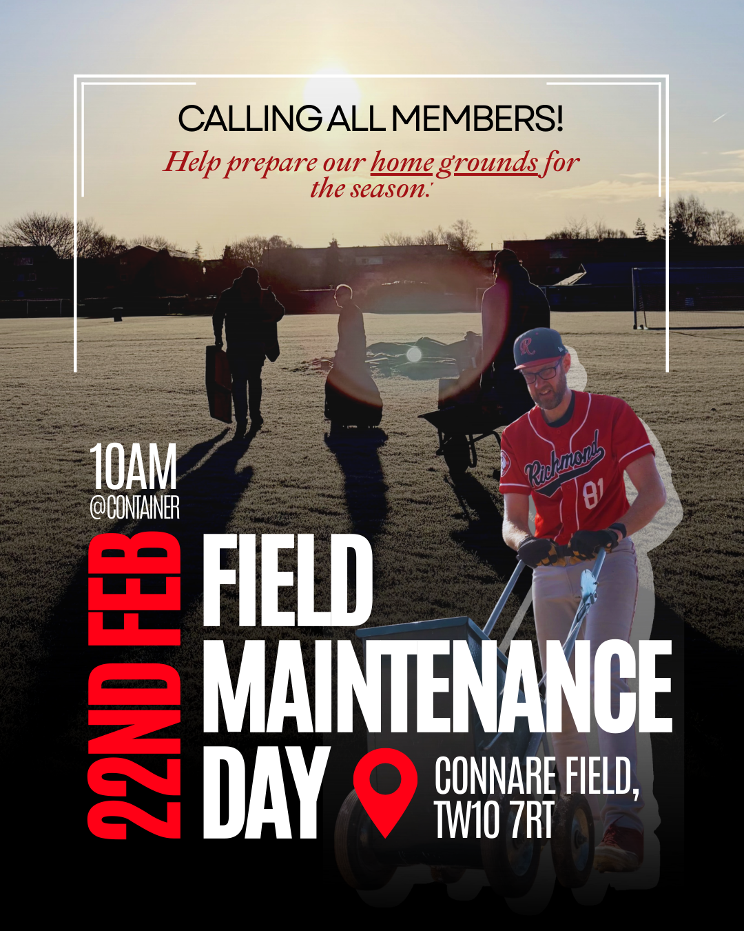 Field Maintenance Day Sunday, February 22, 2026 10:00 AM 2:00 PM 10:00 14:00 Richmond Baseball Club TW10 7RT UK (map) Google Calendar ICS